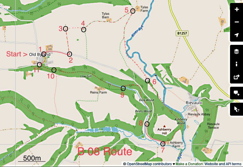 This walk, just over 5 miles, has a good variety of scenery including views looking down into Ryedale towards Rievaulx Abbey and glimpses of the Abbey through the trees. Early in the walk there are fields with cows and calves and a couple of broken stiles; these obstacles can be avoided by walking along a road and joining a farm track. There is also a short length of poached up bridleway that may be muddy after rain. Park in Old Byland village near the green.