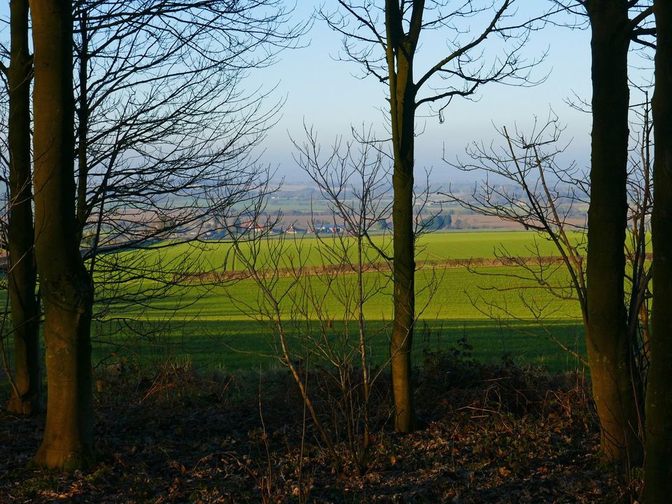 This walk, about 5 miles, passes through a variety of scenery (agricultural, woodland, etc.) with some distant views on a good day. There are bluebells in May!