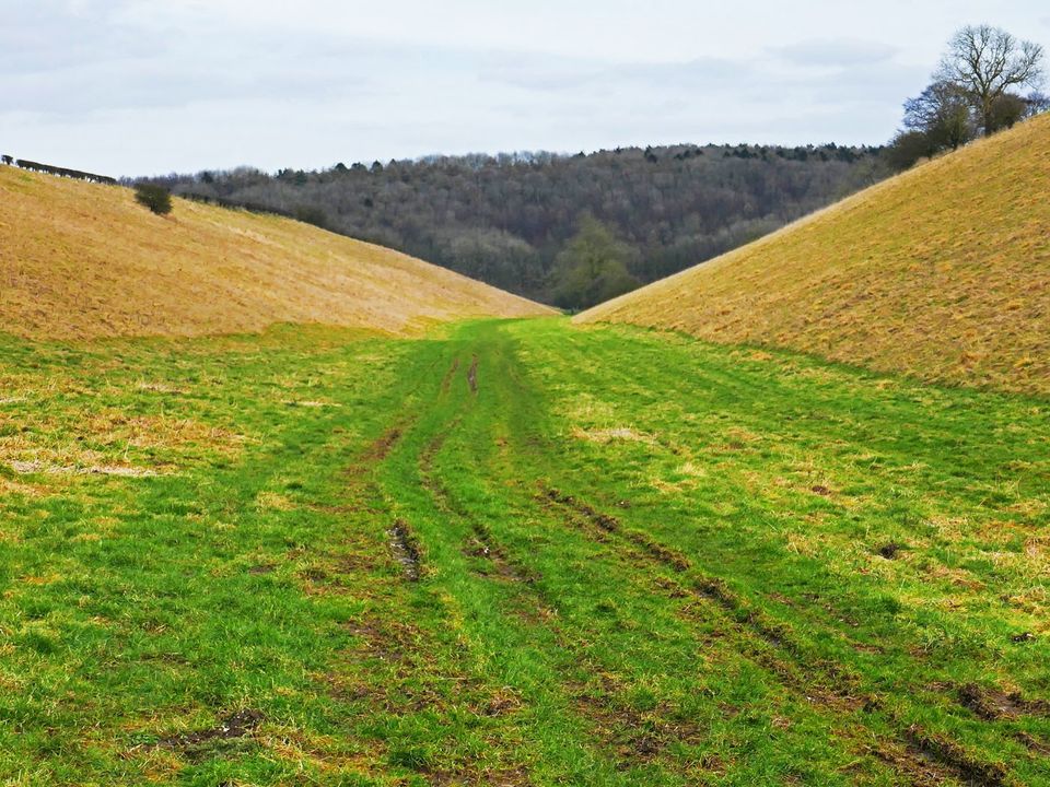 5. (902554) Cross the road (left, right) onto a mud and gravel farm track, then through a band of trees and left alongside woodland to a gate. Go through the gate into Shortlands Dale (Access Land with sheep) and follow the path veering right along the bottom of the valley. Continue through a gate into Oxlands Dale and continue along the bottom of this valley to another gate at a junction of valleys. [total 1450m]