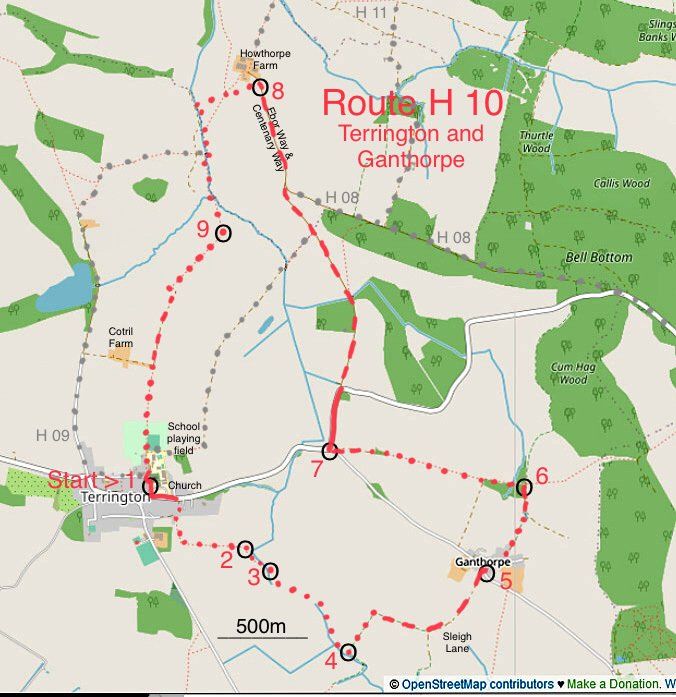 5. (689703) Cross the road into Ganthorpe village, following the village road round a bend to an old pump (?). Turn left through a white garden gate and continue between houses and between a garden and farm yard to a gate into a field. Cross the field to another gate then through another field then slightly right and left to cross a stream. Follow the track to near the end of a wood on the left. [550m]