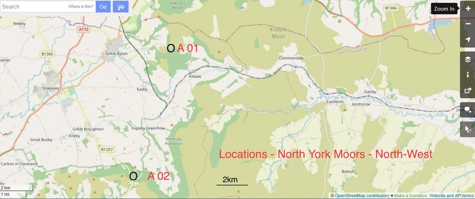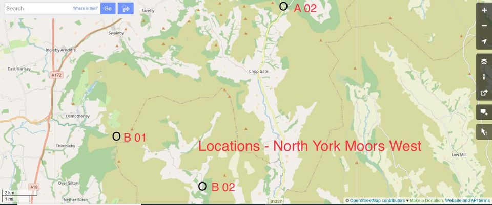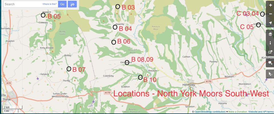 The location maps below show the starting points of each of the walks, indicated by a black circle and a red walk index number. The base maps are from OpenStreetMaps. The darker green areas are woodland and the lighter olive green areas show Access Land. Click on a button for walk route map and directions.